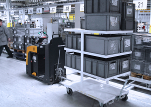iz centralnega skladišča na več proizvodnih linij / from a central warehouse to several stations of an assembly line